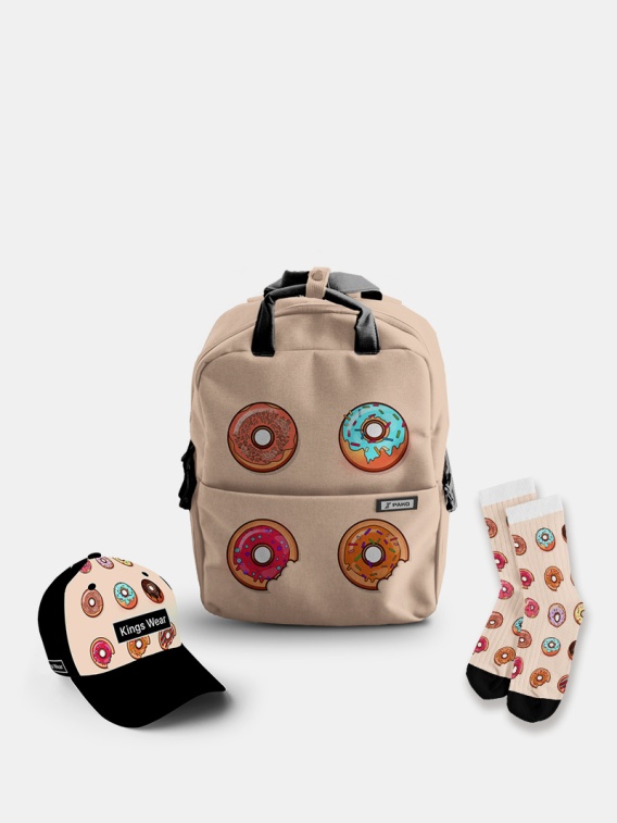Nie musisz już martwić się o to, czy twój strój będzie dobrze zestawiony. Nasz zestaw "Yum Donuts" sprawia, że nawet najbardziej szare dni nabierają kolorów słodyczy. Plecak pomieści wszystkie potrzebne rzeczy na co dzień, a czapka i skarpetki dodadzą ci uroku i oryginalności. W końcu życie jest zbyt krótkie na nudne akcesoria!
